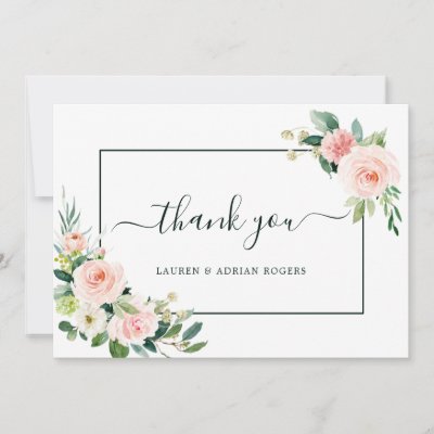 This wedding thank you card features painted watercolor flowers in blush pink white and green foliage with a rectangular frame. For more advanced customization of this design Please click the "Customize further" link. Matching items are also available. myWedding