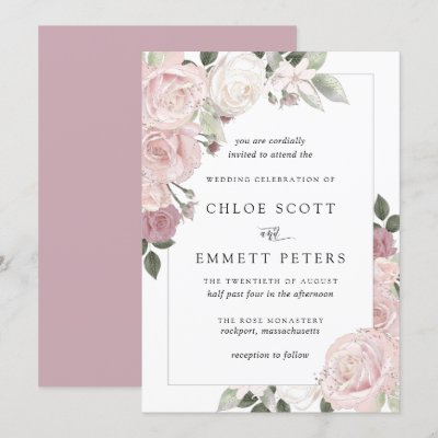 Soft barely there pastel roses decorate the front of this wedding invitation. The roses are white blush pink and deep mauve pink. They are nestled in soft sage green foliage and leaves. The wedding invitation back is deep mauve. This invitation is part of the Barely Blush Rose collection. It contains the templates you need to create a unique and beautiful wedding invitation suite plus personalize your wedding ceremony and reception. myWedding