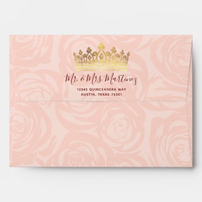 Elegant return address envelopes that are unique and beautiful for your quinceanera birthday celebration sweet 16 party wedding bridal shower or other special occasion. The modern design depicts a harmonious palette of rose gold blush pink and burgundy hues. On the back flap of these floral wedding envelopes a royal gold tiara crown hovers above a template area for you to add your personalized return address details in a pretty combination of a calligraphy script handwriting and modern sans serif fonts. The piece compliments perfectly with the QuinceaƱera invitations found in this same collection... Love butterflies or roses and want to tie them in to your party theme? Gold butterfly confetti adds sparkle to the deep maroon inside and a watercolor rose pattern can be seen lightly over the entire outer side for a luxurious look fit for a queen or princess. The artwork on these elegant quinceanera envelopes can be personalized to your party should you have alternate theme in mind. Ballroom dresses come in a vast array of colors after all and maybe you'd like your invitations and envelopes to compliment... With the click of a mouse change the background shape color the hue of the roses and even what faux metallic finish the crown and butterflies are in! By customizing the design further you will discover silver rose gold and even glitter diamond sparkle and "choose your own" crown color selections. For weddings a 15th or 16th birthday... you decide! Create the perfect looking floral envelopes for your big day. Category: sweet sixteen (or fifteen); 5x7 return address wedding envelopes; and elegant rose pink envelopes. Quinceanera color palette: rose gold pink gold blush maroon burgundy red marsala and white. myWedding