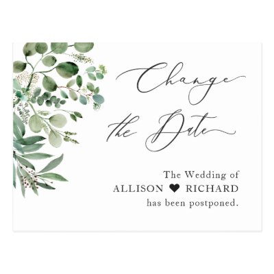 Event Postponed Announcement Template - Change the Date Elegant Greenery Eucalyptus Leaves Postcard. (1) For further customization please click the "customize further" link and use our design tool to modify this template.(2) If you need help or matching items please contact me. myWedding