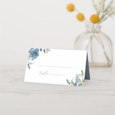 Chic dusty blue watercolor flowers with botanical branches wedding place cards. myWedding