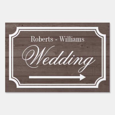 Elegant personalized wooden texture wedding yard sign pointing left or right. Turn arrow to your preference. Help guests find their way to your vintage reception party. Classy double sided design with stylish border plus last name of bride and groom. Fancy traditional style script typography. Available for left and right direction. Personalizable directional road signage board. Also handy for parking lot photo booth or cocktail bar in different locations. Available in small medium and large. Brown and white rustic colors. Country chic wood grain panel background texture or customizable background color. myWedding
