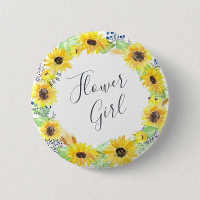 Identify the key players at your bridal shower with our rustic country chic floral buttons. Button features a watercolor floral wreath of yellow sunflowers and navy blue wildflower buds with "flower girl" inscribed inside in hand lettered script. Designed to match our Flowerfields collection. Additional bridal party roles available. myWedding