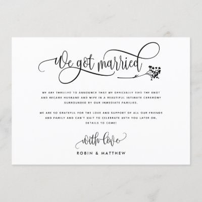 Tell family and friends the great news of your wedding with this elegant "We got Married" Announcement Card. Feel free to add your own message ours is simply an example. Simple and modern black and white design with hand written calligraphy details. Back of card with elegant decorative logo with bride and groom's full names. myWedding