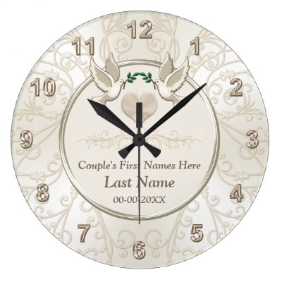 Personalized Elegant Wedding Gifts for Couples. Love Dove Wedding Clock is personalized with the Couple's First and Last Names and Wedding Date or YOUR TEXT or Delete. Soft neutral tones to fit in many rooms. Wonderful gifts for couples anniversary. You can Change the soft champagne off white background color and text to ANY COLORS. CALL Designer Linda: 239-949-9090 to make CHANGES for you at no extra charge or to HELP you customize the beautiful Lovebirds wedding gift. CALL Designer Linda to create a beautiful and elegant wedding present for the bride and groom. Lovely personalized bridal shower gifts ideas too. Beautiful soft tones of champagne and ecru graced with swirls and 2 Love Doves joining their lives together over a heart. I can place this design on hundreds of wedding gift ideas for daughter in law daughter sister or your special friends. Everyone seems to need a clock. Great for their bedroom wedding decor bathroom kitchen and living room. CALL Designer Linda at: 239-949-9090Please Copy and Paste our link into your Internet Browser URL Address Bar to see many more beautiful custom wedding presents. [--] or TEXT Linda for Special Custom Orders or if you would like me to make design changes or for HELP if you would like me to place this design on one of the hundreds of personalized accessories apparel party supplies and gifts.Please SAVE my contact information and store link as there are thousands of independent designers. I offer free custom design service and changes to any of my personalized gifts. [--]) or TEXT Little Linda Pinda Designs:239-949-9090Great for custom wedding shower present or inexpensive yet very special personalized unique wedding gifts for couples who have everything. They won't have this. myWedding