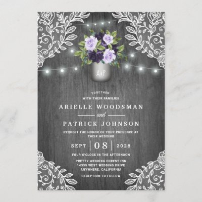 Purple Silver Gray Floral Rustic Mason Jar Wedding Invitations - feature gray or silver vintage/rustic barn wood background with string lights and floral lace. The design also features elegant flowers in various shades of purple in a silver mason jar that you can customize to the initials of your choice. myWedding