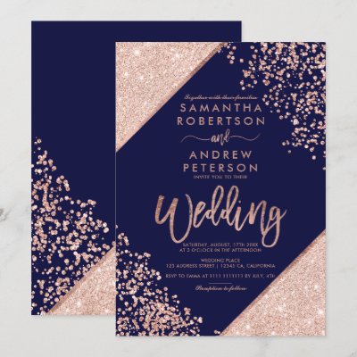 Rose gold glitter confetti chic navy blue wedding invitation