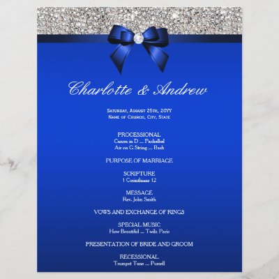 Elegant royal blue and silver wedding program with a beautiful glittery silver printed image sequins jewels gems pattern cute sophisticated shiny blue printed bow and ribbon and pretty digital diamond bling jewel with gray text on a royal blue gradient background. If you need any assistance customizing your product please contact me through my store and I will be happy to help. PLEASE NOTE: These are flat printed graphics - not real bows jewels or sequins. myWedding