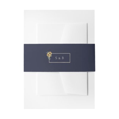 Rustic watercolor sunflower bouquet accented on navy blue color background with pale faux gold frame monogramed wedding invitation belly bands. myWedding