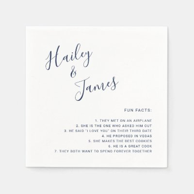 Simple Navy Blue Handwritten Fun Facts Wedding Napkins