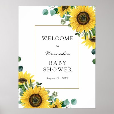 Welcome guests to your baby shower with this beautiful poster featuring a gold frame surrounded by eucalyptus leaves sunflowers and greenery. Add the guest of honor's name shower date and custom welcome text using the fields provided. myWedding
