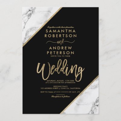 Gold marble stripes typography black wedding invitation